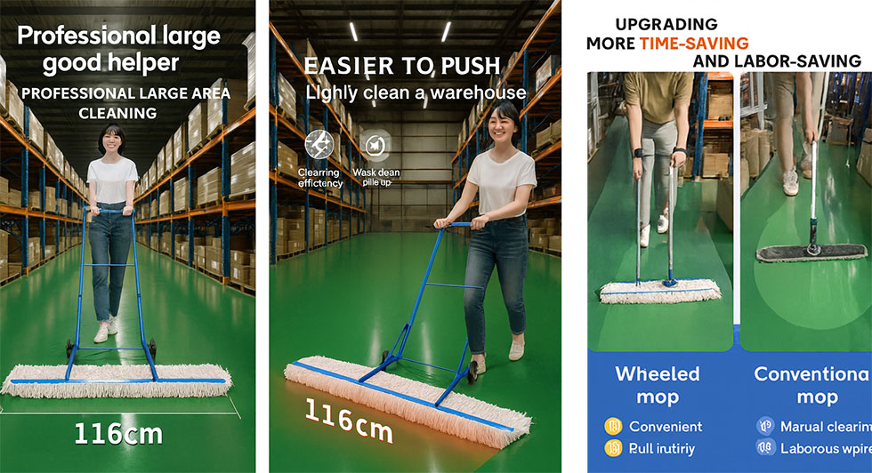 This commercial push mop is ideal for large indoor spaces that require fast and consistent daily cleaning. From warehouses and logistics centers to factory aisles, storage areas, and distribution facilities, it helps maintain a clean, safe, and professional work environment. Whether dealing with dust, debris, or high-traffic pathways, it ensures wide coverage and efficient cleaning across expansive floors.