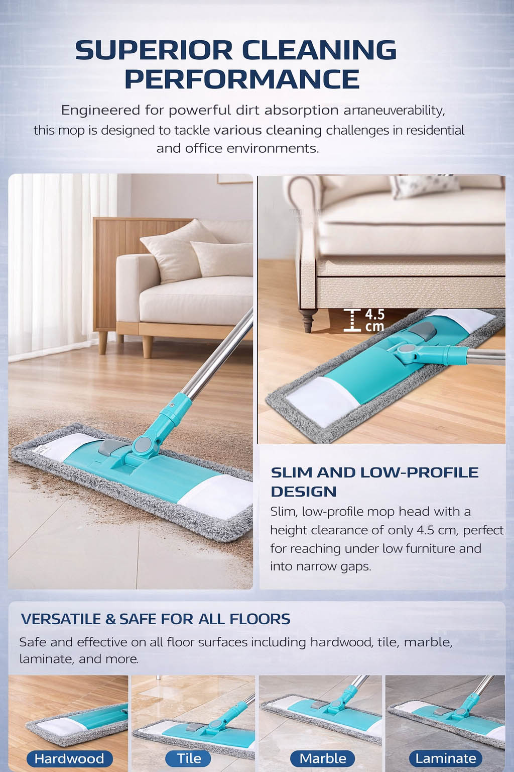 This microfiber dust mop is designed for both wet and dry cleaning, featuring a 360° rotating flat head that easily reaches deep under beds, sofas and cabinets below 4.5cm. The three-layer composite mop pad includes a powerful dirt-absorbing microfiber layer, a thick absorbent sponge core and a strong water-locking fiber layer for superior performance. Its slim profile glides into tight gaps and corners, making it ideal for hardwood, tile, marble and laminate floor cleaning. The stainless steel handle ensures durability and stability during daily household use. Lightweight and maneuverable, it provides efficient, streak-free cleaning for kitchens, bathrooms and living areas.
