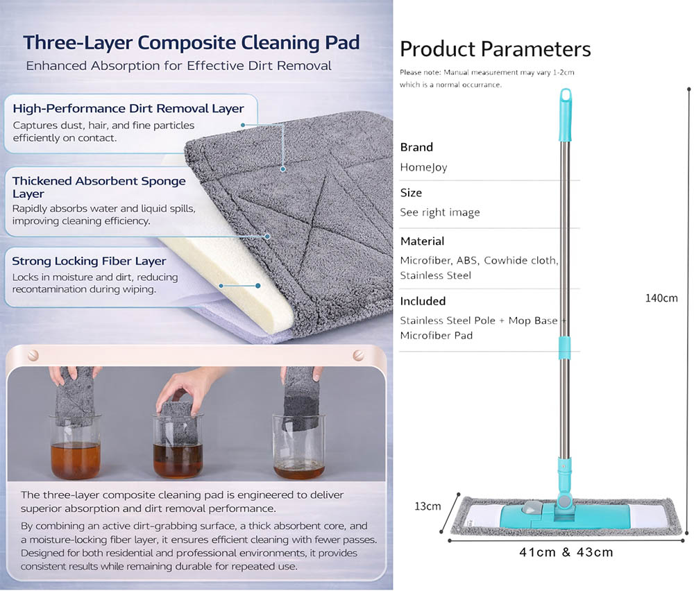 | Mop Head Type | Three-layer composite: microfiber + sponge + water-locking fiber |
