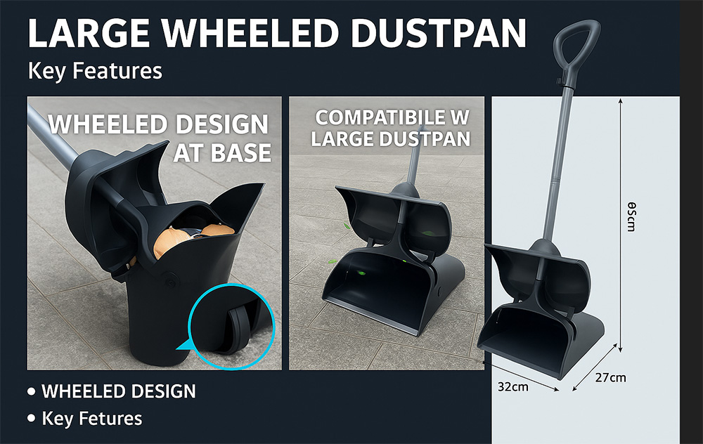 A2: The dustpan features an extended front edge and deep pan structure that prevents dust and debris from blowing away during outdoor cleaning.